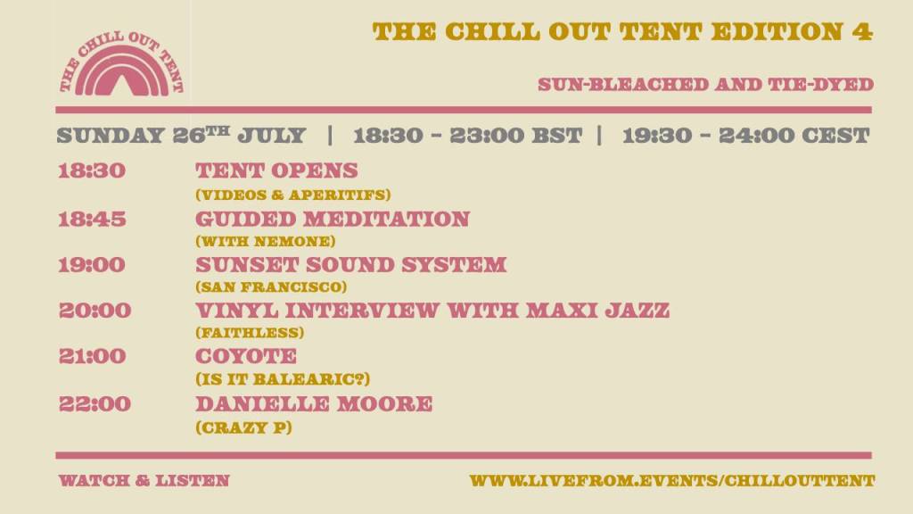 Here’s the line up for this weekend’s Edition 4 of the Chill Out Tent, live from 18:30 BST, looks like a awesome evening ahead…