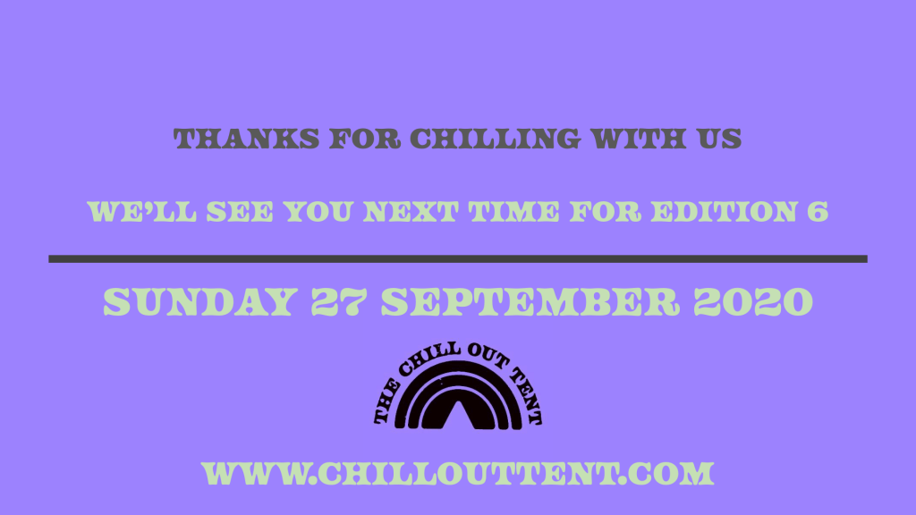 Here’s the line up for this weekend’s Edition 5 of the Chill Out Tent, coming live from 18:00 BST on Sunday, 30 August 2020. Save the date, we’ll be in a carnival mood, with a sunny outlook and only a slight risk of a squally shower. The line up looks fab, it’s hot, starting mellow and ending with one of our legendary after party slots.