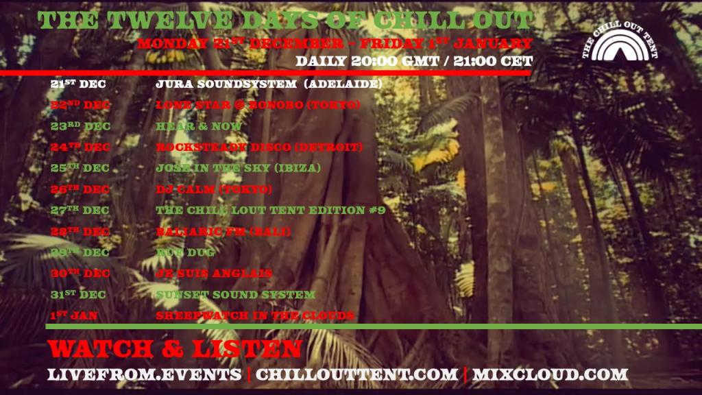 To celebrate the coming of the Winter Solstice we will be streaming some of our favourite sets from 2020 every day at 20:00 GMT from the 21/12/20 to 1/1/21. At what might be stressful and difficult time we thought sharing some beautiful films and music might provide some calming escapism, and a chance to connect with the lovely Chill Out Tent community. Here’s the schedule…