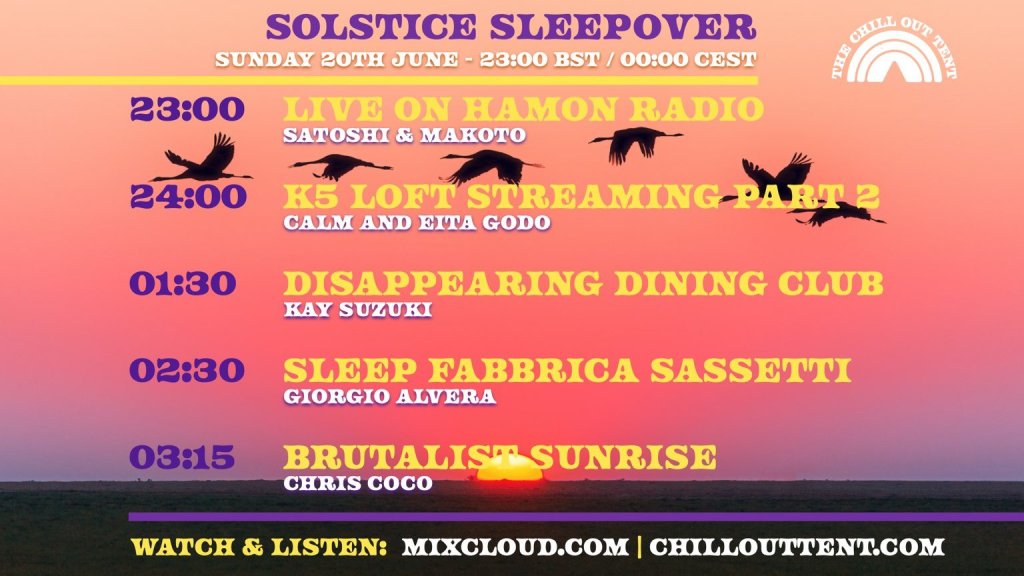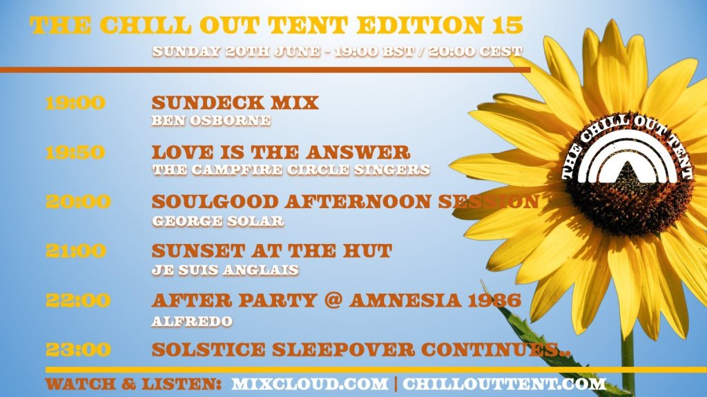 We’re back slightly early this month, for Edition #15 of the Chill Out Tent and it’s a special event to coincide with the Summer Solstice. Join us on Sunday June 20th at 19:00-23:00 BST for this special extended longest day program…